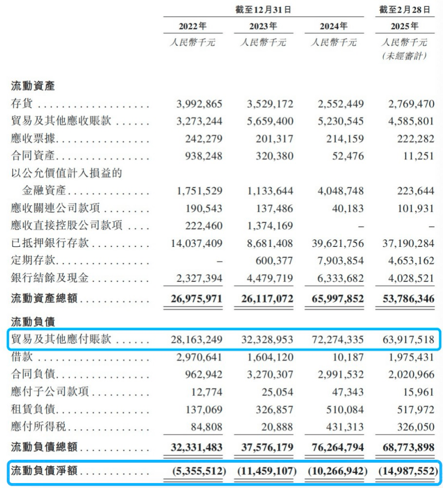 从偿债能力指标看,赛力斯87%的高资产负债率已接近行业警戒区间;0.86流动比率则显著低于1的安全阀值,居高不下的流动负债净额也说明了这一点。