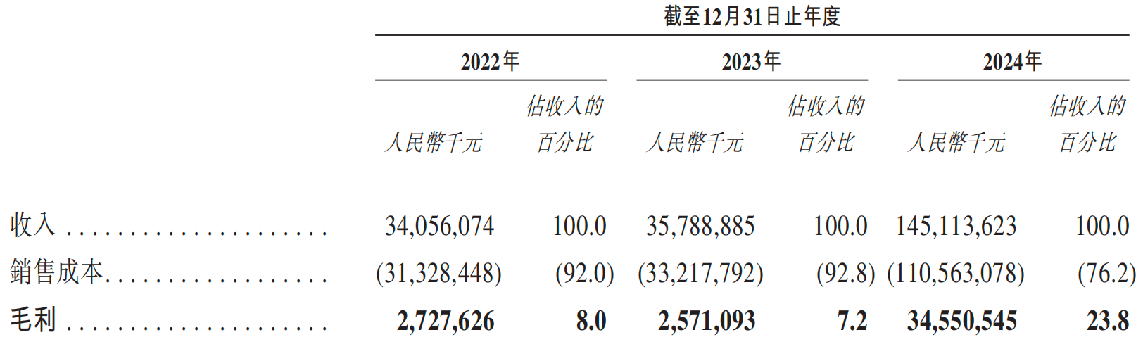 这一成绩的背后,是其经营业绩的显著提升:收入由2023年的人民币358亿元增加至2024年的人民币1,451亿元,同比增长305.5%;