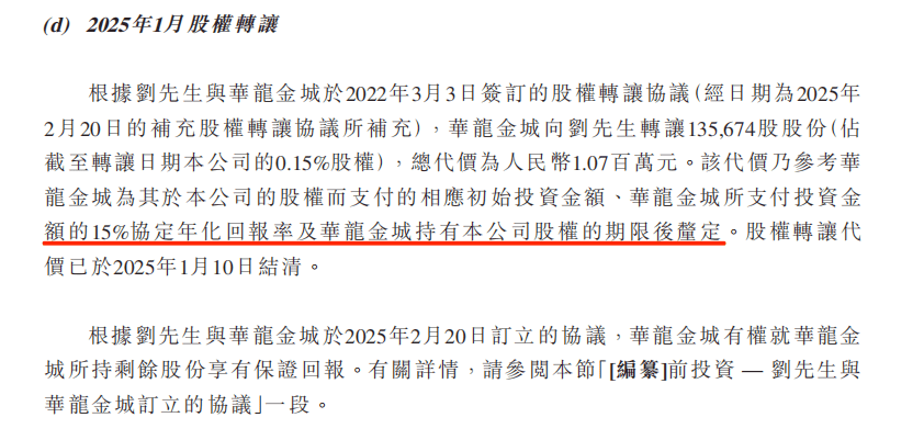 2025年2月20日,刘金虎与华龙金城订立股份回报协议,约定禁售期届满后,华龙金城可出售全部股份,若售股收入低于按2020年7月3日至2026年6月30日15%年化固定回报率计算得出的1837万元,刘金虎需自掏腰包补足差额;若售股收入超出1837万元,超额收益则双方五五分成。