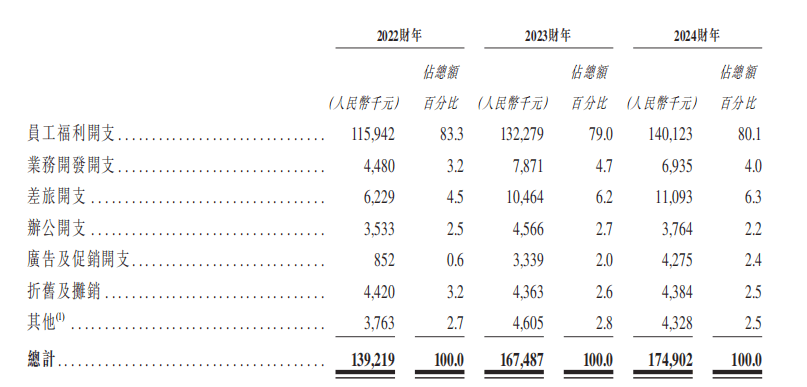 《财中社》发现,2022-2024财年,公司销售开支分别为1.39亿元、1.67亿元、1.75亿元,占当年收入的比例分别为36.9%、33.4%、36.2%,居高不下。销售开支中8成都是员工福利薪酬,三年给员工发放薪酬福利总额约为3.88亿元。