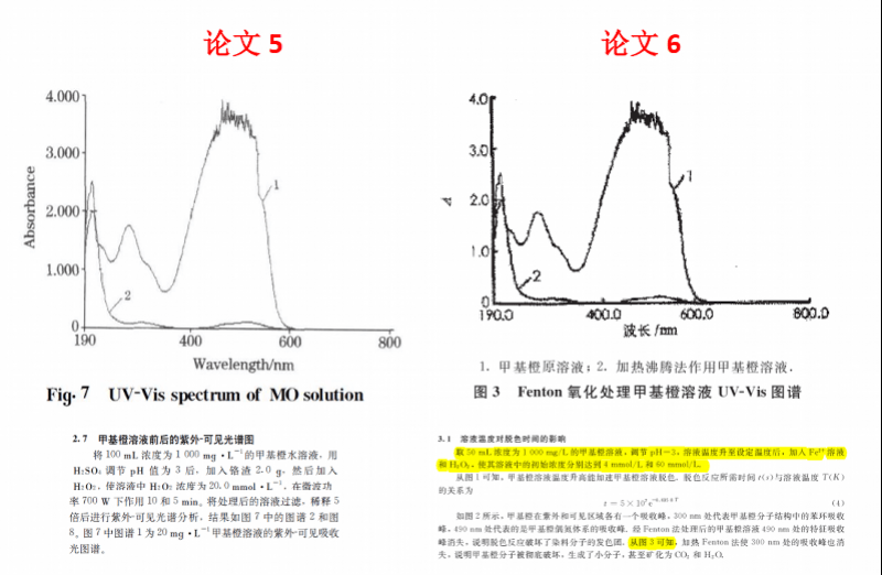 举报信称,例如,刘某华为第一作者兼通讯作者,于2008年发表在《光谱学与光谱分析》的论文《微波促进含铬废渣催化H2O2降解甲基橙溶液研究》中的图7,与刘某华为第三作者,于2007年发表在《西南大学学报(自然科学版)》的论文《温度对 Fenton 法催化脱色甲基橙溶液影响的研究》中的图3高度一致,“却对应不同的实验条件,涉嫌伪造论文中的样品测试结果,虚构实验事实”。