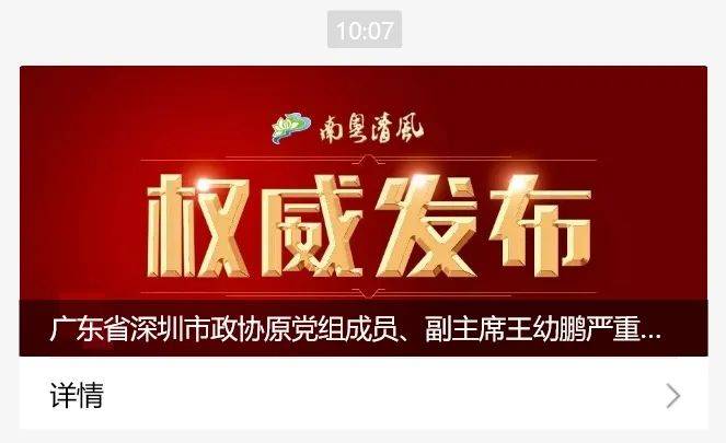 奥一新闻注意到,刚刚,“南粤清风”发布一则通告, 广东省深圳市政协原党组成员、副主席王幼鹏严重违纪违法被开除党籍和公职。