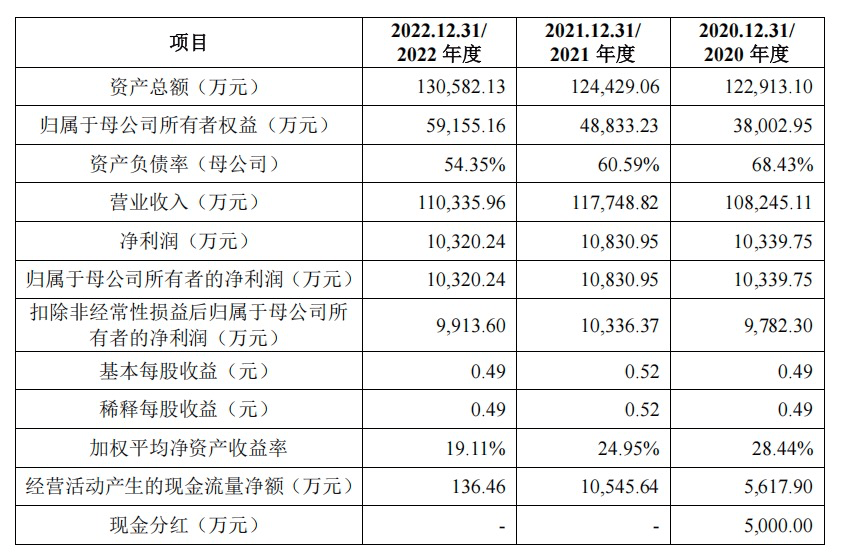业绩方面,2020年度、2021年度和2022年度,公司营业收入分别为10.82亿元、11.77亿元和11.03亿元,净利润分别为1.03亿元、1.08亿元和1.03亿元。