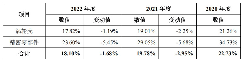 毛利率持续走低也是烨隆股份绕不开的问题。报告期各期,公司主营业务毛利率分别为22.73%、19.78%和18.10%。其中,涡轮壳产品毛利率分别为21.26%、19.01%和17.82%;精密零部件产品毛利率分别为34.73%、29.05%和23.60%,均呈现走低趋势。