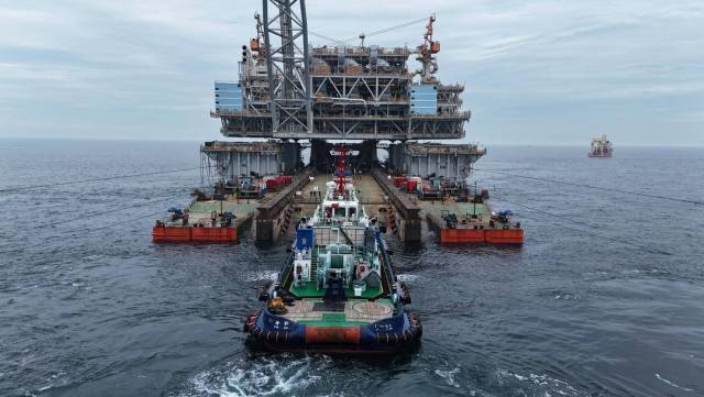 为做好该项目海上组装作业通航安全保障,大连海事局统筹考虑项目水深、潮汐、海流、底质等特殊需求及气象条件、航路分布等因素优化项目选址,划定安全作业区,确保组装作业符合通航安全要求。建立工作专班,对接监管和服务保障需求。开辟海事手续办理绿色通道,确保组装作业各环节“准时准点”。全程跟踪严控作业风险,加装5G信号放大器、船载CCTV等设备,结合船舶自动识别系统(AIS)、无人机等对组装作业进行全程监控,并在组装关键节点调派海巡船艇进行巡查巡护,严格把控作业水域通航风险。(刘金盈 张翰真 图片由大连海事局提供)