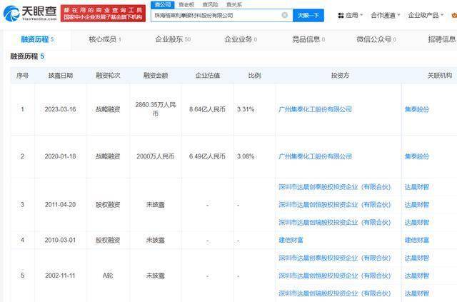 天眼查显示,格莱利经历多轮融资,投资者包括集泰股份、达晨财智、建信财富。2023年3月,格莱利获集泰股份2860.35万元战略投资,当时企业估值为8.64亿元。