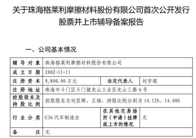 瑞财经 王敏 5月12日,珠海格莱利摩擦材料股份有限公司(以下简称“格莱利”)在广东证监局进行IPO辅导,辅导机构为申万宏源证券。