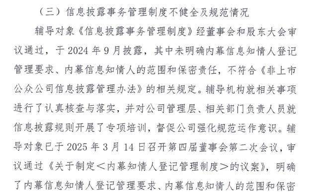 报告显示,公司《信息披露事务管理制度》经董事会和股东大会审议通过,于2024年9月披露,其中未明确内幕信息知情人登记管理要求、内幕信息知情人的范围和保密责任,不符合《非上市公众公司信息披露管理办法》的相关规定。公司已于2025年3月14日召开第四届董事会第二次会议,明确了事项。