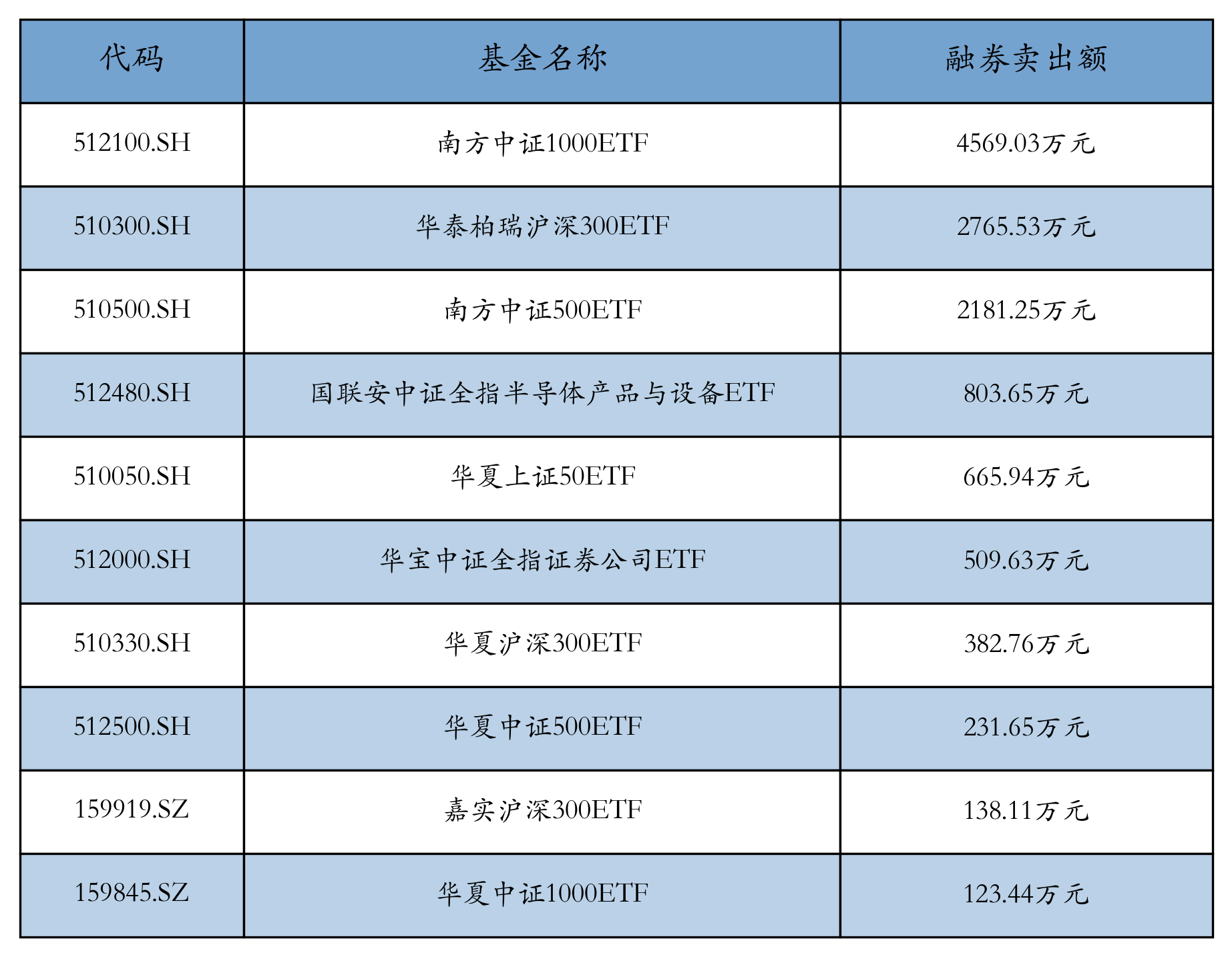 5月13日ETF融券卖出额前三位分别为:南方中证1000ETF(4569.03万元)、华泰柏瑞沪深300ETF(2765.53万元)和南方中证500ETF(2181.25万元),前10具体见下表: