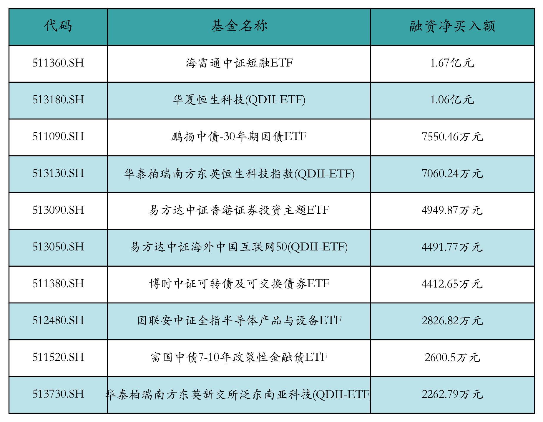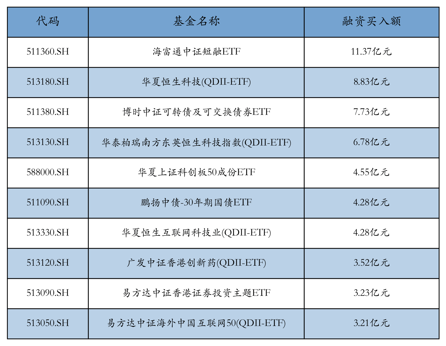 5月13日ETF融资买入额前三位分别为:海富通中证短融ETF(11.37亿元)、华夏恒生科技(QDII-ETF)(8.83亿元)和博时中证可转债及可交换债券ETF(7.73亿元),前10具体见下表: