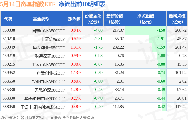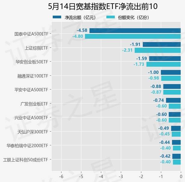 当日有89只宽基指数ETF基金出现资金净流出,其中净流出排首位的是国泰中证A500ETF(159338),份额减少了4.8亿份,净流出额为4.58亿元。
