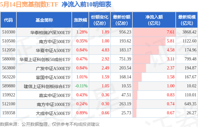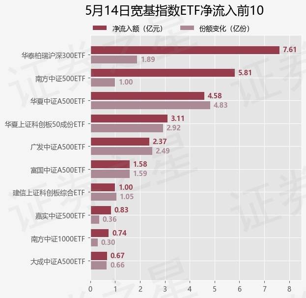 当日有54只宽基指数ETF基金出现资金净流入,其中净流入排首位的是华泰柏瑞沪深300ETF(510300),份额增加了1.89亿份,净流入额为7.61亿元。