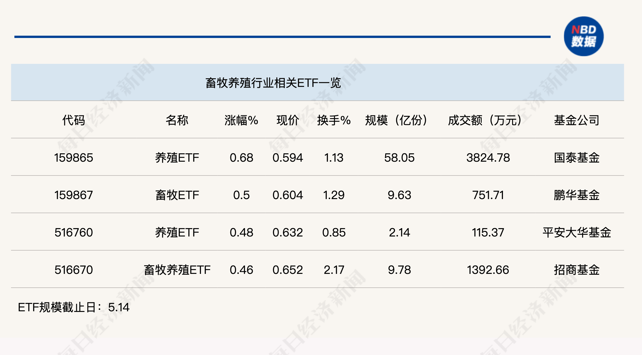 今日上午,A股热点分散,水产品、宠物经济、合成生物等涨幅靠前。ETF市场方面,畜牧养殖类ETF整体涨幅靠前,平均涨幅超过0.5%。