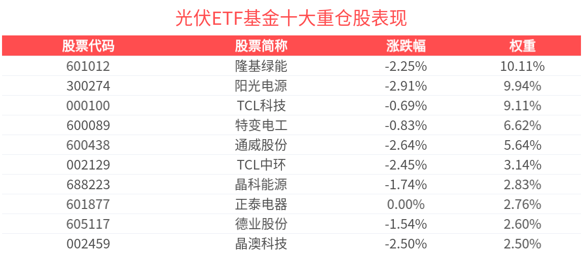数据显示,截至2025年4月30日,中证光伏产业指数(931151)前十大权重股分别为隆基绿能(601012)、阳光电源(300274)、TCL科技(000100)、特变电工(600089)、通威股份(600438)、TCL中环(002129)、正泰电器(601877)、德业股份(605117)、晶科能源(688223)、晶澳科技(002459),前十大权重股合计占比56.17%。