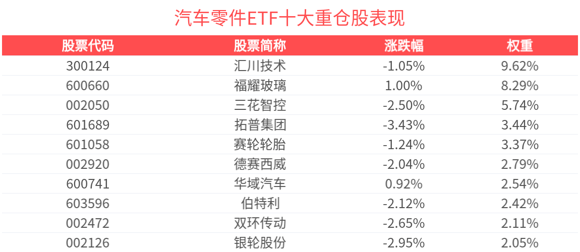 数据显示,截至2025年4月30日,中证汽车零部件主题指数(931230)前十大权重股分别为汇川技术(300124)、福耀玻璃(600660)、三花智控(002050)、拓普集团(601689)、赛轮轮胎(601058)、德赛西威(002920)、华域汽车(600741)、伯特利(603596)、双环传动(002472)、万丰奥威(002085),前十大权重股合计占比45.48%。