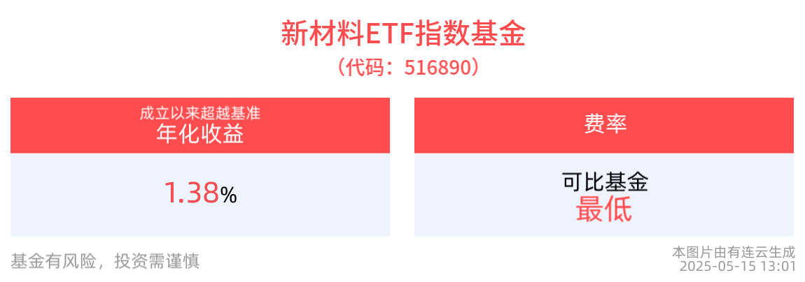 新材料ETF指数基金(516890)下跌1.19%,最新报价0.5元。拉长时间看,截至2025年5月14日,新材料ETF指数基金近1周累计上涨2.02%。