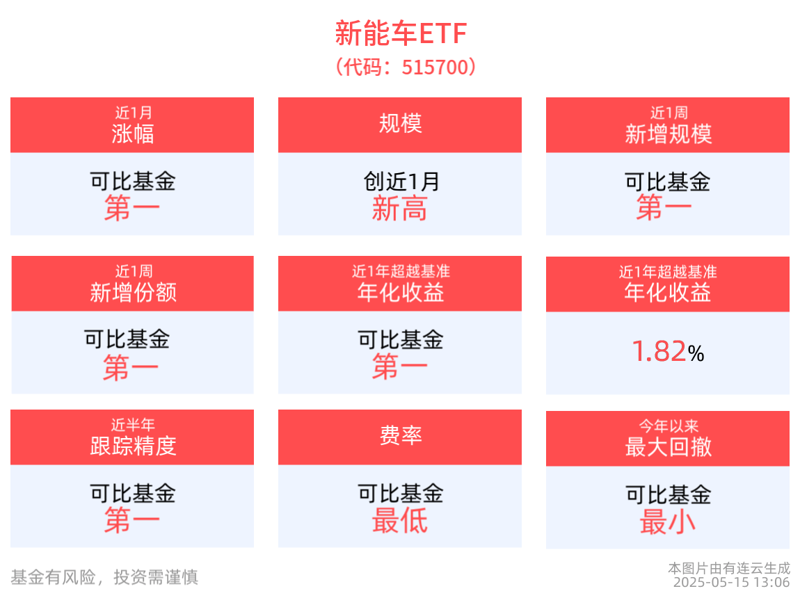 新能车ETF(515700)下跌0.78%,最新报价1.65元。拉长时间看,截至2025年5月14日,新能车ETF近1周累计上涨3.35%,涨幅排名居同类第一。