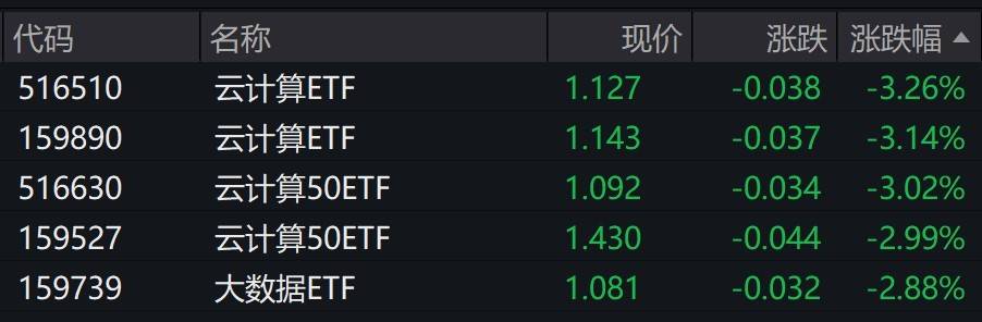 受盘面影响,跟踪中证云计算与大数据主题指数的ETF跌约3%。