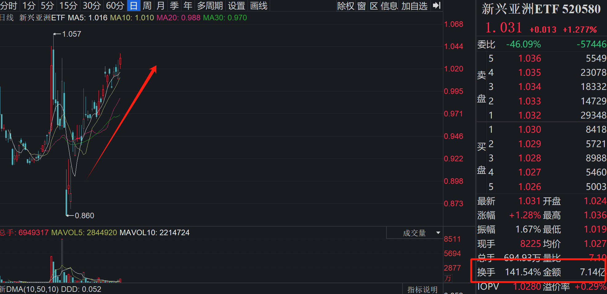 指数强势ETF自然关注度就高。目前场内印度含量比较高的跨境ETF当属$新兴亚洲ETF(SH520580)$,截至目前盘中成交额高达7亿,换手率高达142%!