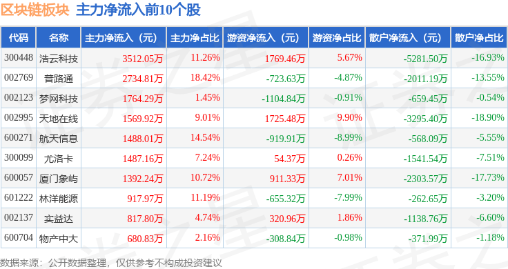 从资金流向上来看,当日区块链板块主力资金净流出101.28亿元,游资资金净流入16.69亿元,散户资金净流入84.59亿元。区块链板块个股资金流向见下表: