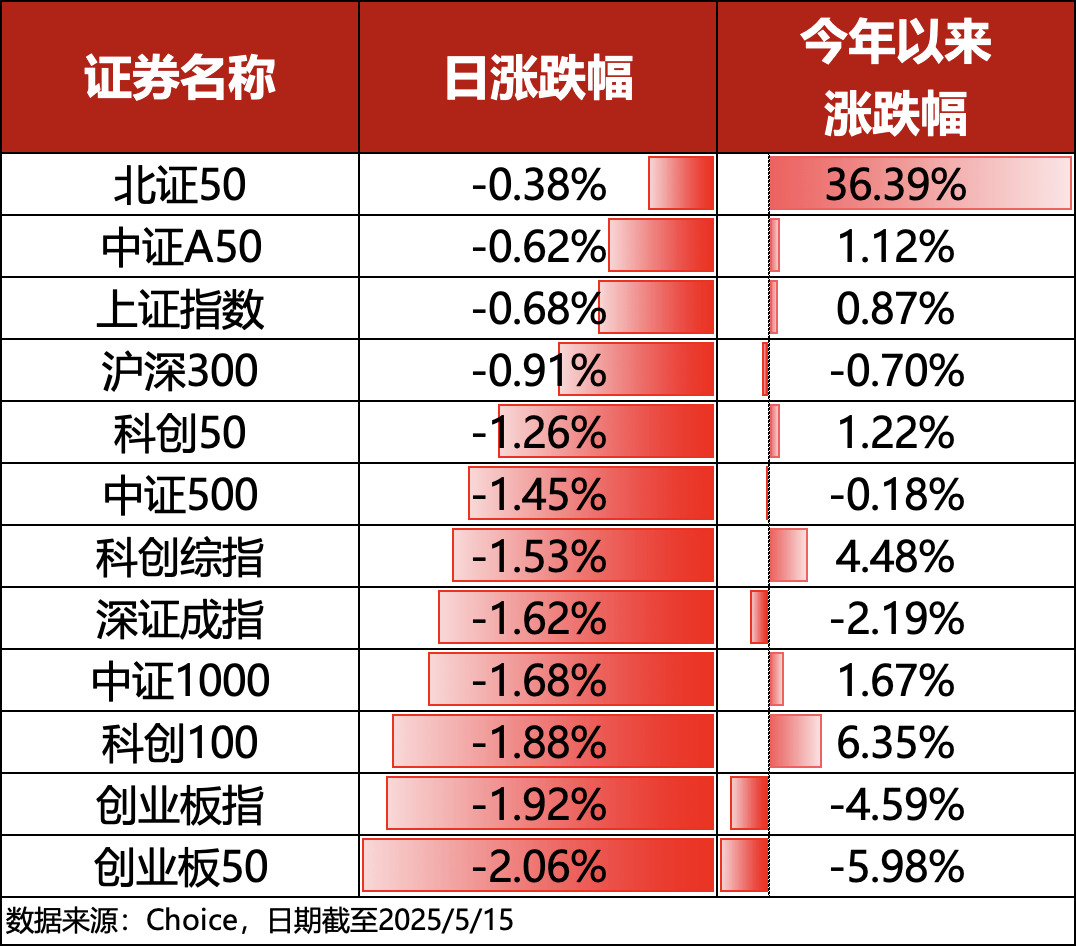 5月15日,A股主流宽基指数集体回调。其中,上证指数收跌0.68%,深证成指收跌1.62%,创业板指收跌1.92%,全市场仅约1400只个股上涨。主流宽基指数中,北证50指数下跌0.38%,跌幅相对较小。