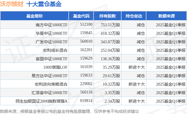 根据2025基金Q1季报公募基金重仓股数据,重仓该股的公募基金共12家,其中持有数量最多的公募基金为南方基金的南方中证1000ETF。南方中证1000ETF目前规模为514.38亿元,最新净值2.4672(5月14日),较上一交易日上涨0.16%,近一年上涨12.29%。该公募基金现任基金经理为崔蕾。崔蕾在任的基金产品包括:南方顶峰TOPIX-ETF,管理时间为2019年6月12日至今,期间收益率为48.1%;南方中证申万有色金属ETF发起联接A,管理时间为2019年7月12日至今,期间收益率为65.85%;南方中证申万有色金属ETF,管理时间为2019年7月12日至今,期间收益率为67.61%。