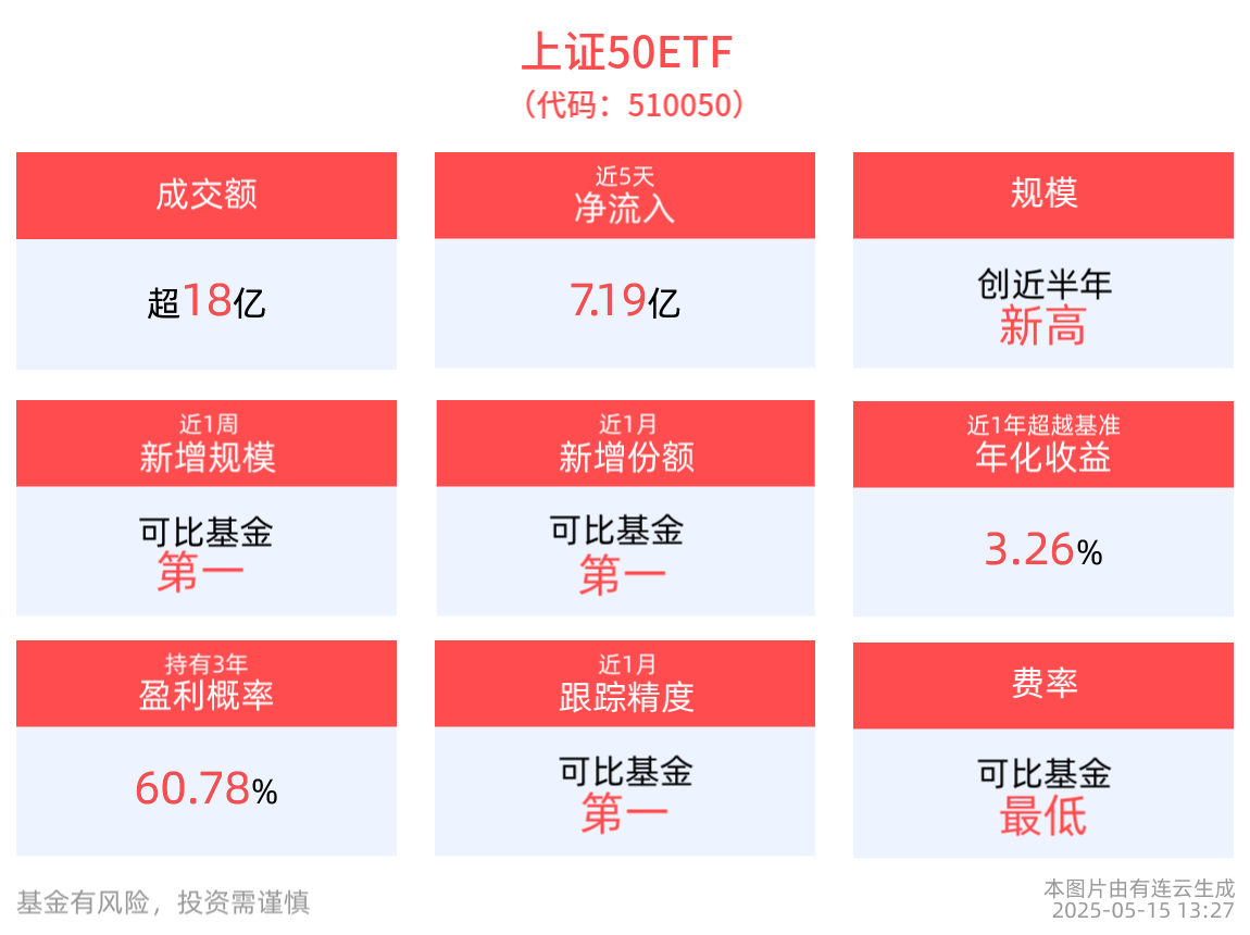 跟踪精度方面,截至2025年5月14日,上证50ETF近1月跟踪误差为0.015%,在可比基金中跟踪精度最高。
