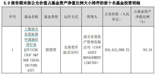 虽然根据资料显示,其跟踪的是标普中国新经济行业指数,但从一季报披露的情况来看,至少截至3月31日,其实际未持有任何股票资产,仅持有一只基金——在港股上市的工银南方东英标普中国新经济行业ETF,自2020年产品成立以来一直如此。