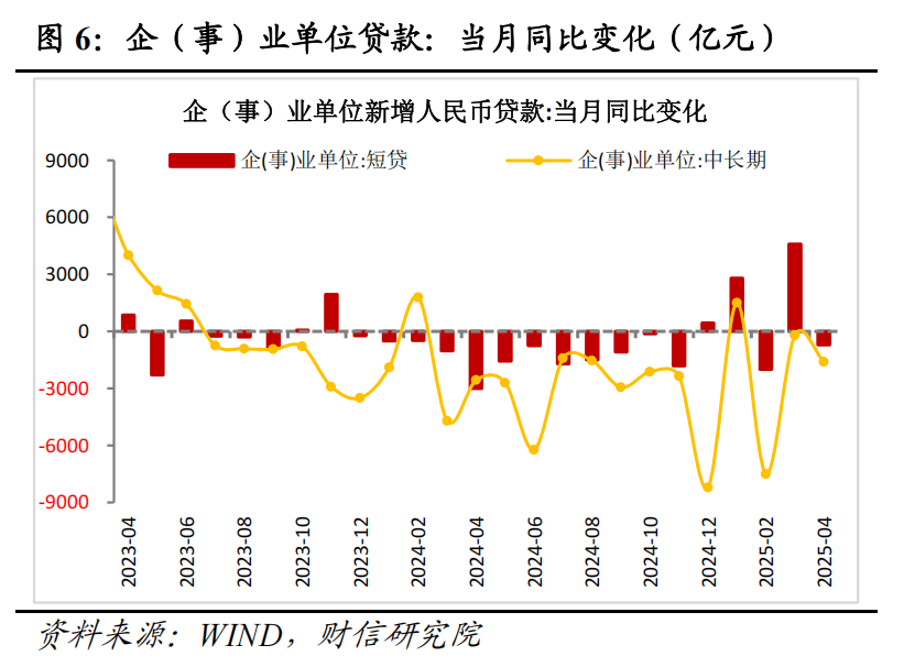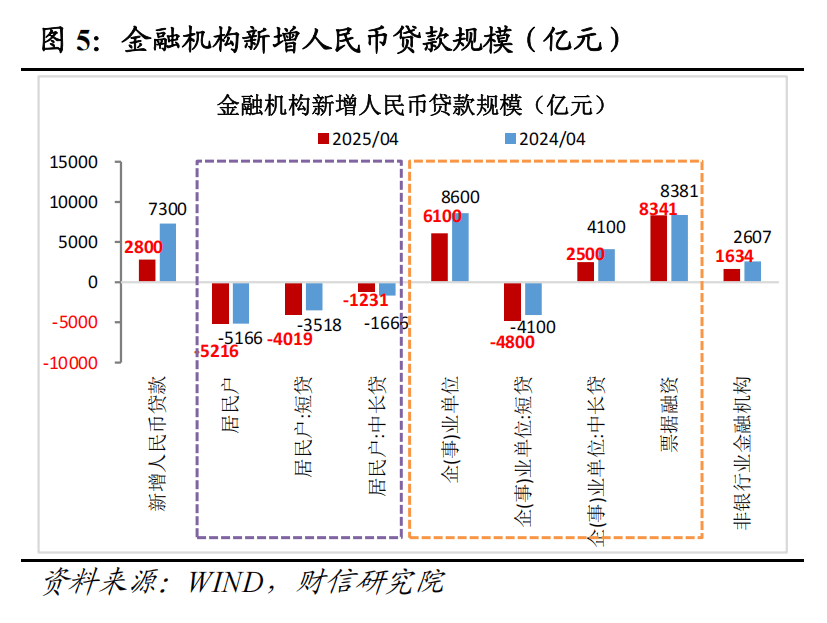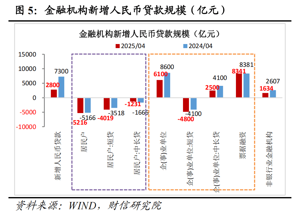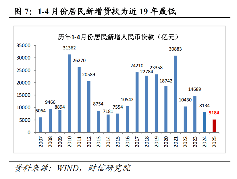 (二)关税冲击加剧实体信贷需求不足,居民、企业融资需求均偏弱。4月新增人民币贷款2800亿元,同比少增4500亿元(见图5);各项贷款增速较上月回落0.2个百分点至7.2%,重回2023年二季度以来的回落态势,刷新历史新低,实体需求不足仍待政策加力支持破局。分结构看,票据冲量特征明显,居民短贷、中长贷和企业短贷、中长贷均偏弱:一是面对实体自发性的信贷需求明显走弱,银行大幅增加票据投放,本月票据融资达8341亿元,约为近五年同期均值的2倍。二是受关税冲击导致企业投融资意愿下降、上季末银行利用企业短贷冲量透支部分需求、结构性政策工具余额连续四个季度下降(截止2025Q1)等因素的叠加影响,企业短贷、中长贷分别为-4800、2500亿元,分别同比减少700、1600亿元(见图5-6),拖累明显。三是受居民消费动力不足、消费贷利率上调、30大中城市销售再度转负等的拖累,4月居民短贷、中长贷双双转负,分别为-4019、-1231亿元。从累计数据看,1-4月份居民部门新增贷款降至5000亿元左右、占全部信贷比重仅5.2%,均为2007年以来最低水平(见图7),居民部门信贷需求不足矛盾仍突出。
