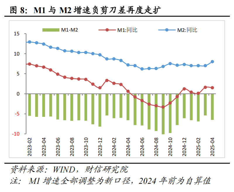 (三)低基数等支撑M2反弹,地产走弱和关税冲击拖累M1回落。4月M2增速较上月提高1个百分点至8.0%(见图8),一方面源于低基数的贡献,如2024年4月份,受规范手工补息、债市火爆导致存款搬家买理财产品等因素的影响,M2增速较上月大幅回落1.1个百分点;另一方面与非银存款同比多增1.9万亿元密切相关。相比之下,信用创造速度放缓等因素,则不利于M2增速的回升。4月M1增速为1.5%(见图8),在去年同期基数大幅回落的基础上仍较上月回落0.1个百分点,其中M0、居民活期存款、非银支付机构客户备付金三大分项增速稳中有升,单位活期存款增速有所回落,为主要拖累。单位活期存款增速回落背后或主要源于三点:一是地产销售转负,拖累显著;二是关税冲击显现,企业盈利承压;三是随着化债推进,城投等主体偿还部分债务,导致企业活期存款减少。此外,本月M1与M2增速负剪刀差走扩1.1个百分点至-6.5%,反映出宽货币向宽信用传导仍待畅通,特朗普关税给经济带来一定压力。