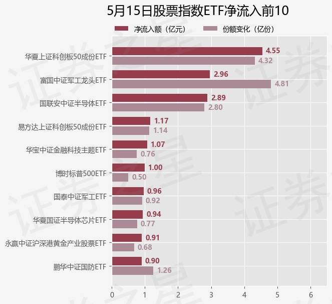 当日有178只股票指数ETF基金出现资金净流入,其中净流入排首位的是华夏上证科创板50成份ETF(588000),份额增加了4.32亿份,净流入额为4.55亿元。