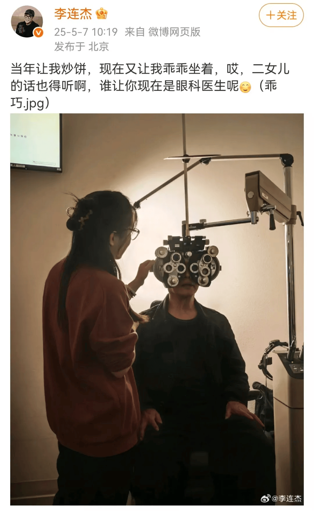 就在一天前,他刚晒出相似照片,并写道:当年让我炒饼,现在又让我乖乖坐着,哎,二女儿的话也得听啊,谁让你现在是眼科医生呢(乖巧.jpg)。