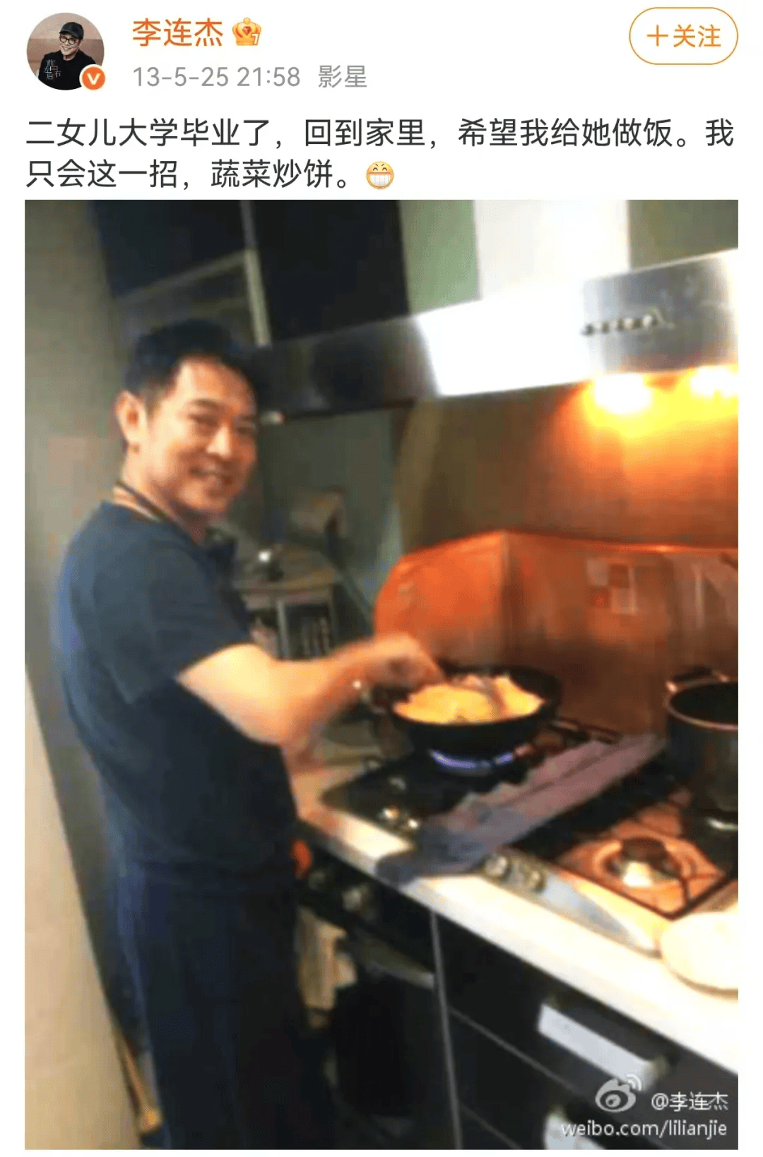 当时,李连杰晒出一张做饭照,并表示,“二女儿大学毕业了,回到家里,希望我给她做饭。我只会这一招,蔬菜炒饼。”