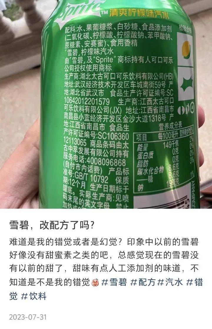 这两天,有网友在社交平台上发帖表示“雪碧悄悄换了配方”,并配图文说,随手拿起一瓶多年没喝的雪碧,感觉不是记忆中的味道,一看配料表发现配料表里有“蔗糖素、安赛蜜”,下方有4000多千条网友跟帖,大多数网友都表示确实有明显感知,“难怪和小时候喝起来不一样了”“甜味很明显”“喝完嘴里甜腻感明显”。