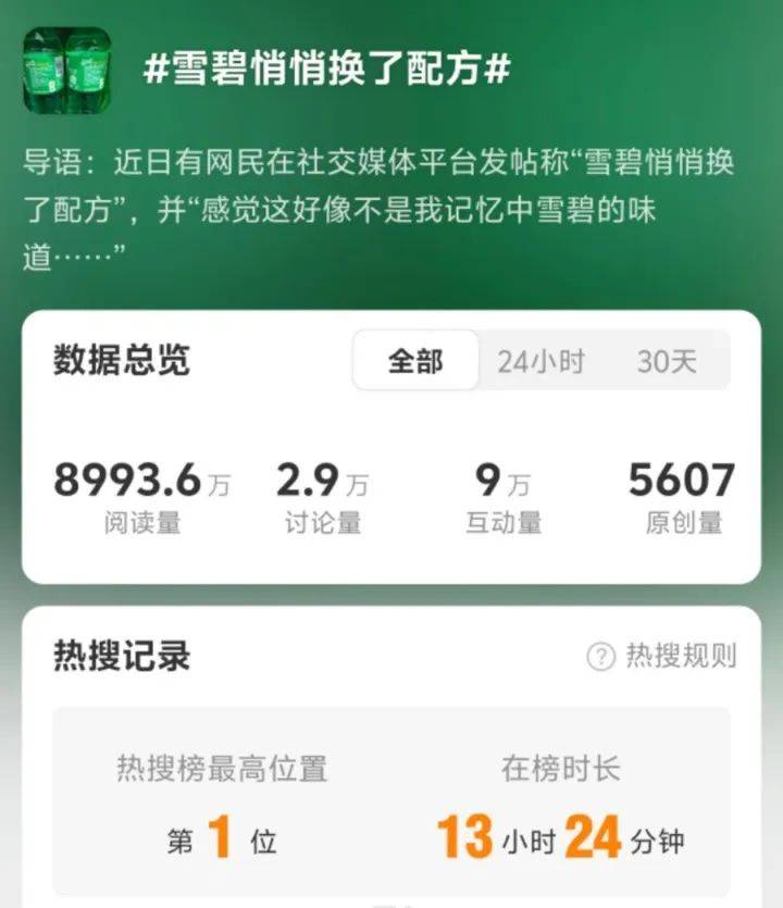 “雪碧换配方”的相关话也经登上了小红书和微博的热搜榜第一名。