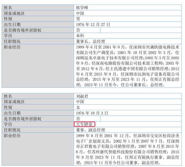 据瑞财社查阅,欧学峰、刘淑君同为1976年出生,今年49岁。欧学峰为本科学历,刘淑君为大专肄业学历。从履历看,两人都有丰富的销售管理经验。