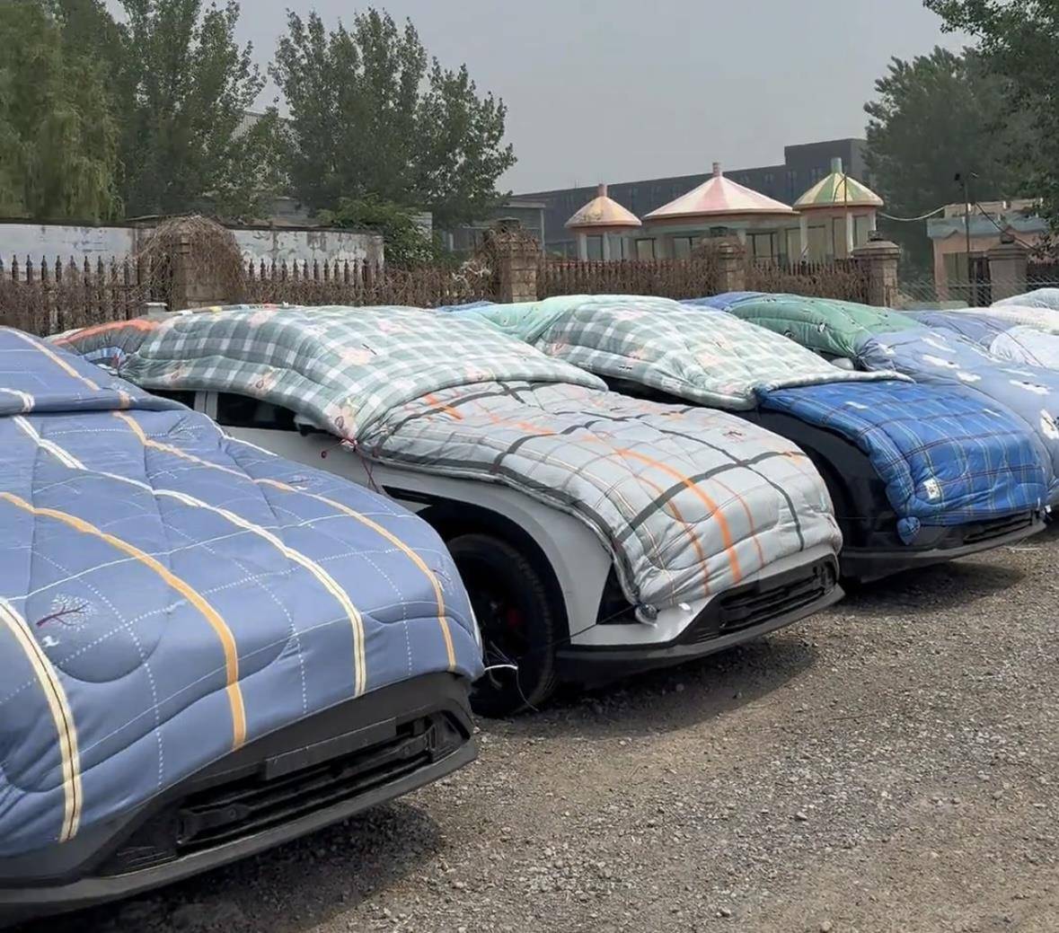 汽车店给未交付的新车盖上被子(来源:视频截图)
