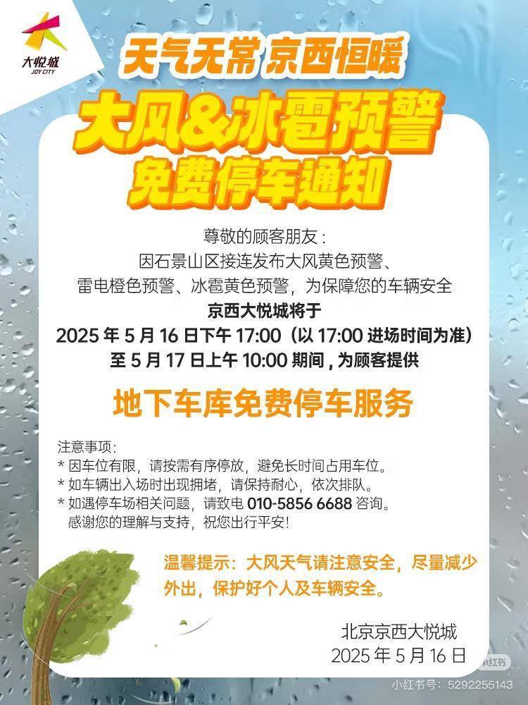 16日,北京京西大悦城发布消息称,因石景山区接连发布大风黄色预警、雷电橙色预警、冰雹黄色预警,为保障顾客车辆安全,16日下午5时至17日上午10时期间,大悦城将为顾客提供地下车库免费停车服务。