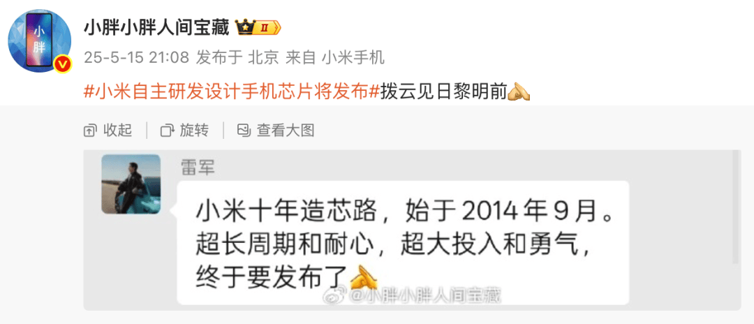 不知道机友们有没有关注到,雷总前些天发布的另一个信息——