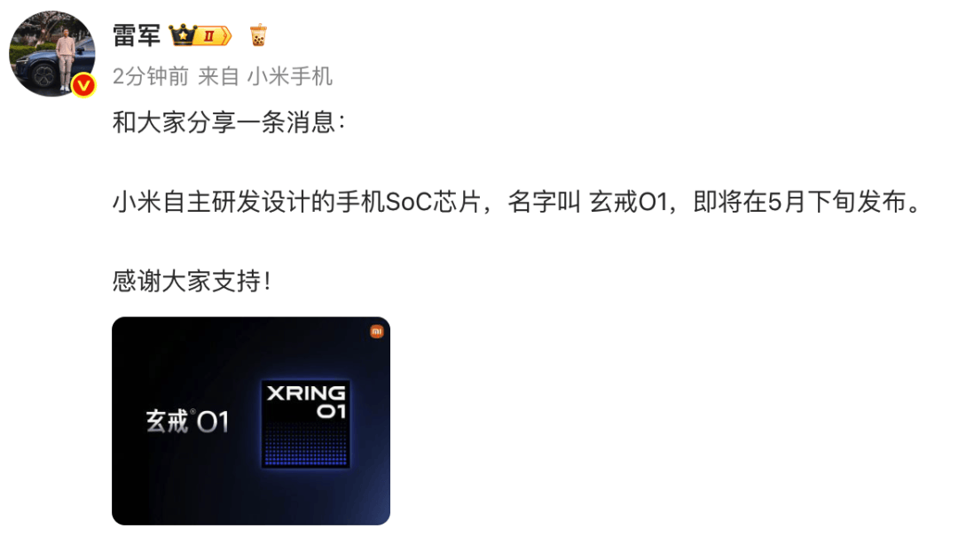 小米自主研发设计的手机 SoC 芯片,正式命名为「玄戒 O1」,发布时间定于 5 月下旬。