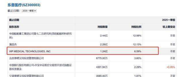 截至2025年3月31日,WP MEDICAL TECHNOLOGIES,INC仍持有乐普医疗6.59%的股份。不过,其持有的股份中,约有68.57%已被办理质押。