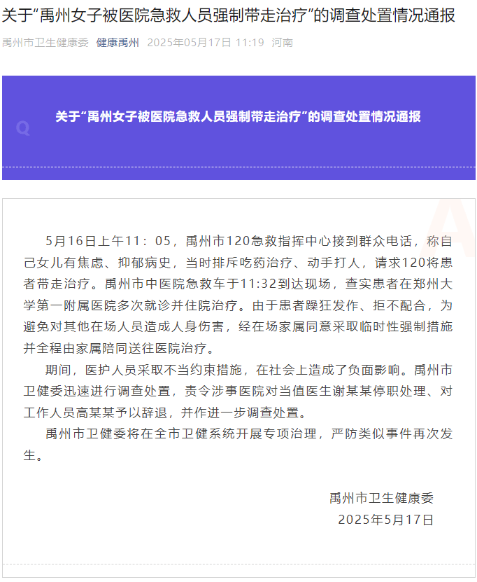 日前,有网友发布视频称,禹州市中医院120急救车的医护人员,疑似用手铐控制一女子,女子向路人呼喊救命,引发网络热议。针对此事,河南省禹州市卫生健康委5月17日发布关于“禹州女子被医院急救人员强制带走治疗”的调查处置情况通报。