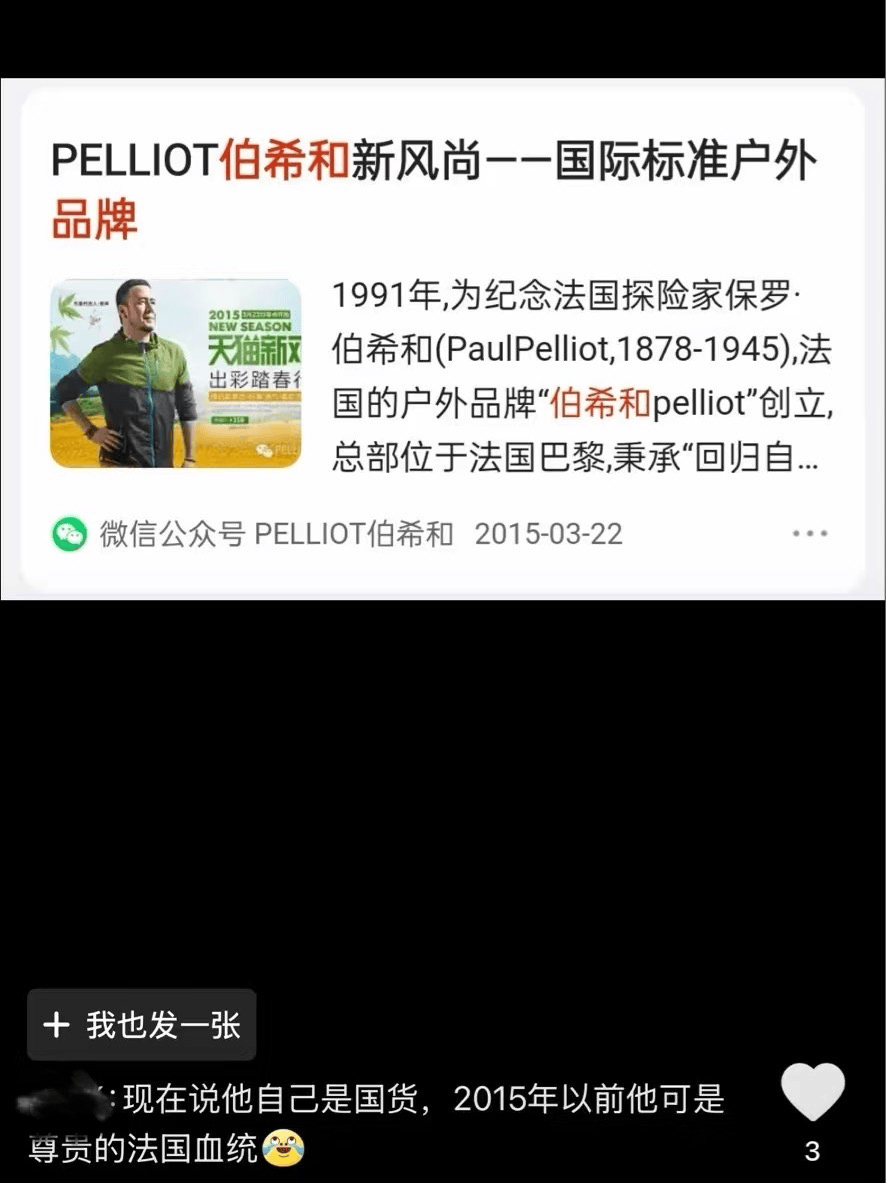 虽然伯希和曾公开否认品牌名称与这名法国人有关,但仍有不少网友对此心存芥蒂,有网友晒出了疑似微信公众号“PELLIOT伯希和”2015年发布的文章截图,文中介绍户外品牌“伯希和pelliot”是为了纪念法国探险家保罗·伯希和创立的,总部位于法国巴黎。不过,这张截图的真实性已难以考证。