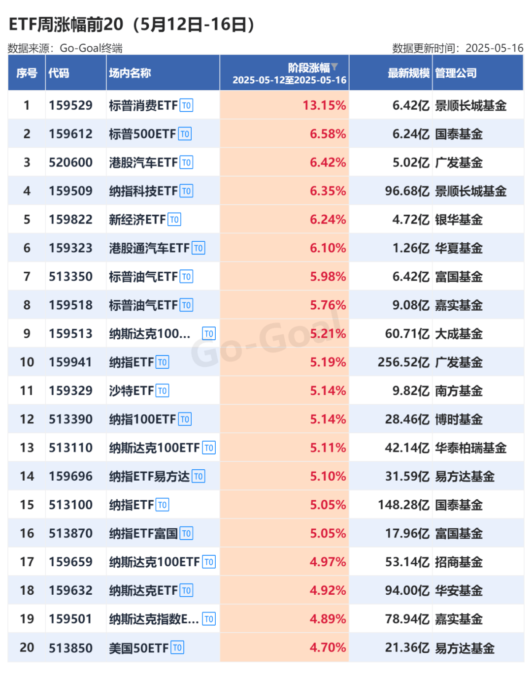 ETF涨跌幅方面,Go-Goal ETF数据显示,本周跨境ETF表现较强,标普消费ETF、标普500ETF等涨幅居前,部分跨境ETF的溢价加剧,其中标普消费ETF溢价率达26.71%,标普500ETF溢价率13.82%。此外,港股汽车ETF、标普油气ETF、沙特ETF等同样涨幅较前。