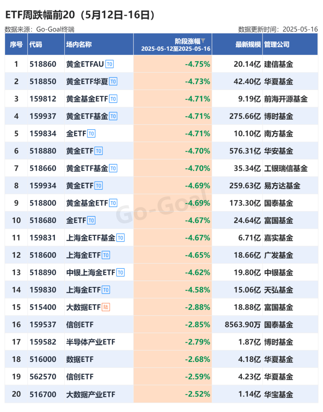 跌幅方面,国际金价创下6个月最大单周跌幅,单周累计跌近4%,黄金类ETF跌幅居前;此外,大数据ETF、信创ETF略有回调。
