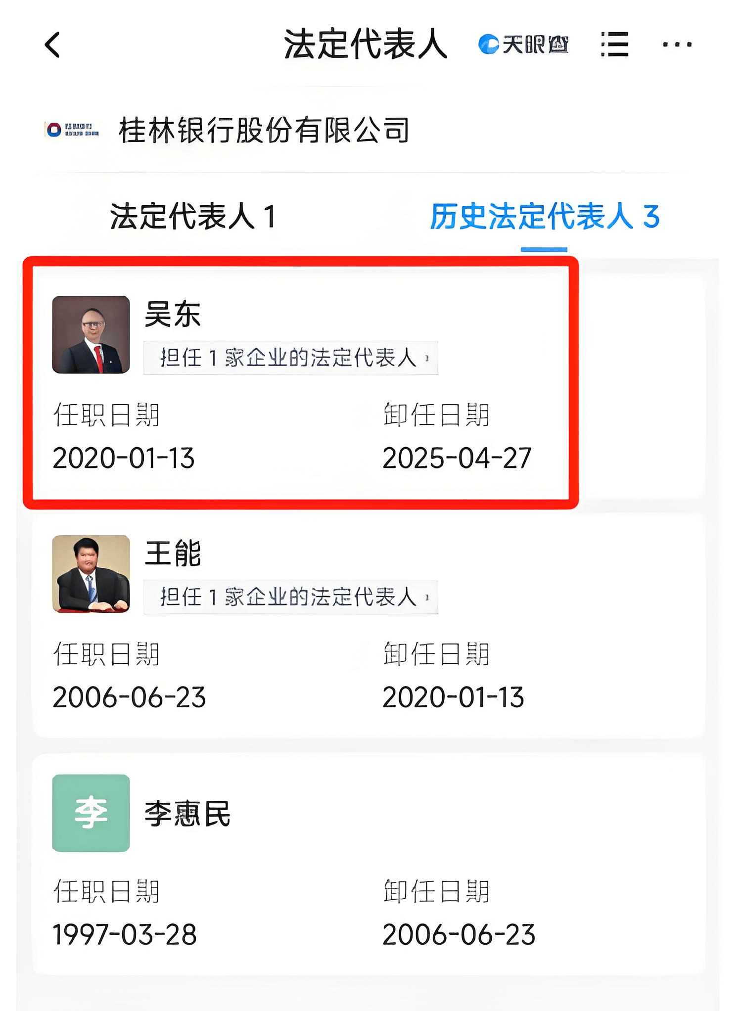 「界面新闻·子弹财经」翻查天眼查发现,4月27日,吴东卸任桂林银行法定代表人,由张先德接任。