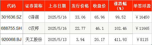 上周共有3只新股上市,分别为江苏天工科技股份有限公司(下称“天工股份”,920068)、江苏汉邦科技股份有限公司(下称“汉邦科技”,688755)、江苏泽润新能科技股份有限公司(下称“泽润新能”,301636)。