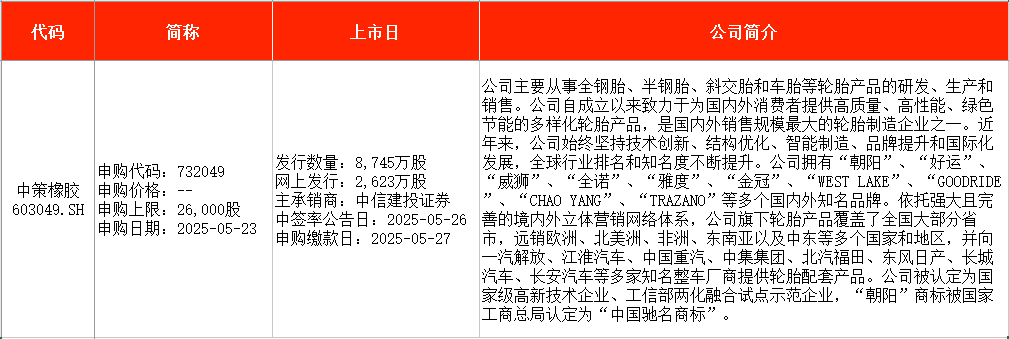 从时间表看,古麒绒材在周一(5月19日)申购,中策橡胶则在周五(5月23日)申购。