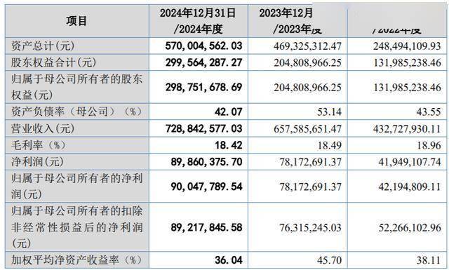 业绩方面,2022年、2023年和2024年(报告期内),公司分别实现营业收入4.33亿元、6.58亿元和7.29亿元,实现归母净利润4219.48万元、7817.27万元和9004.78万元。