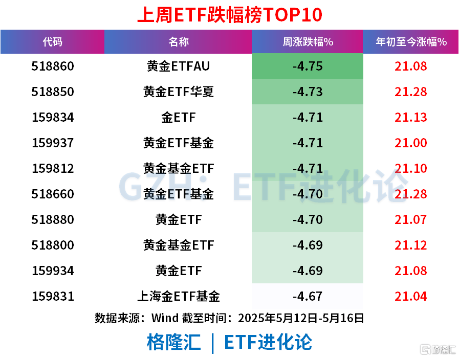 国际金价回调带动黄金ETF全线下挫,黄金ETFAU、黄金ETF华夏、金ETF、黄金ETF基金、黄金基金ETF上周累计跌逾4%。